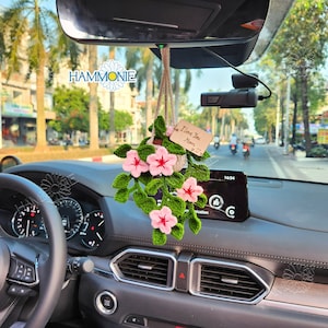 Crochet Cherry Blossom Plant Hanging, Tiny Crochet Plant Car Decor, Car Accessories for Women, Car Mirror Hanging, Custom Plant Lover Gift
